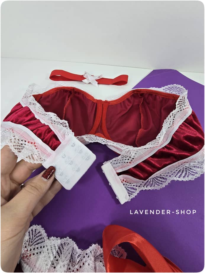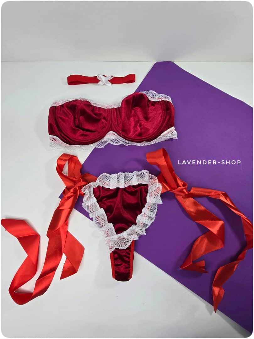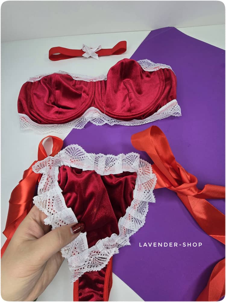 ست لباس زیر سکسی و جذاب مخملی زنانه در رنگ قرمز با تور سفید