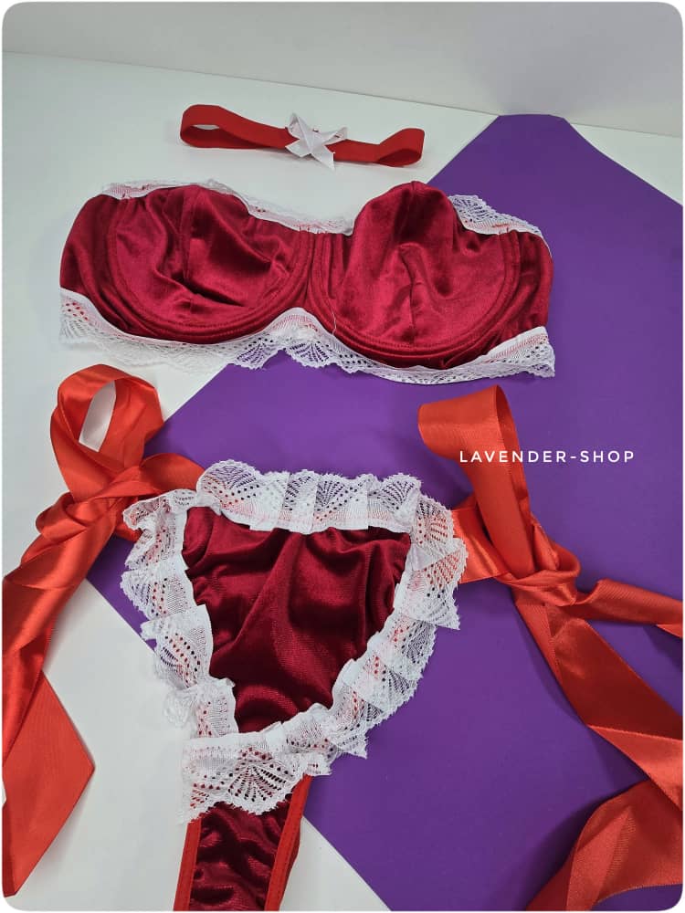 ست مخمل سکسی سه‌تیکه قرمز با تور سفید شامل سوتین، شورت ریبونی و گلوبند