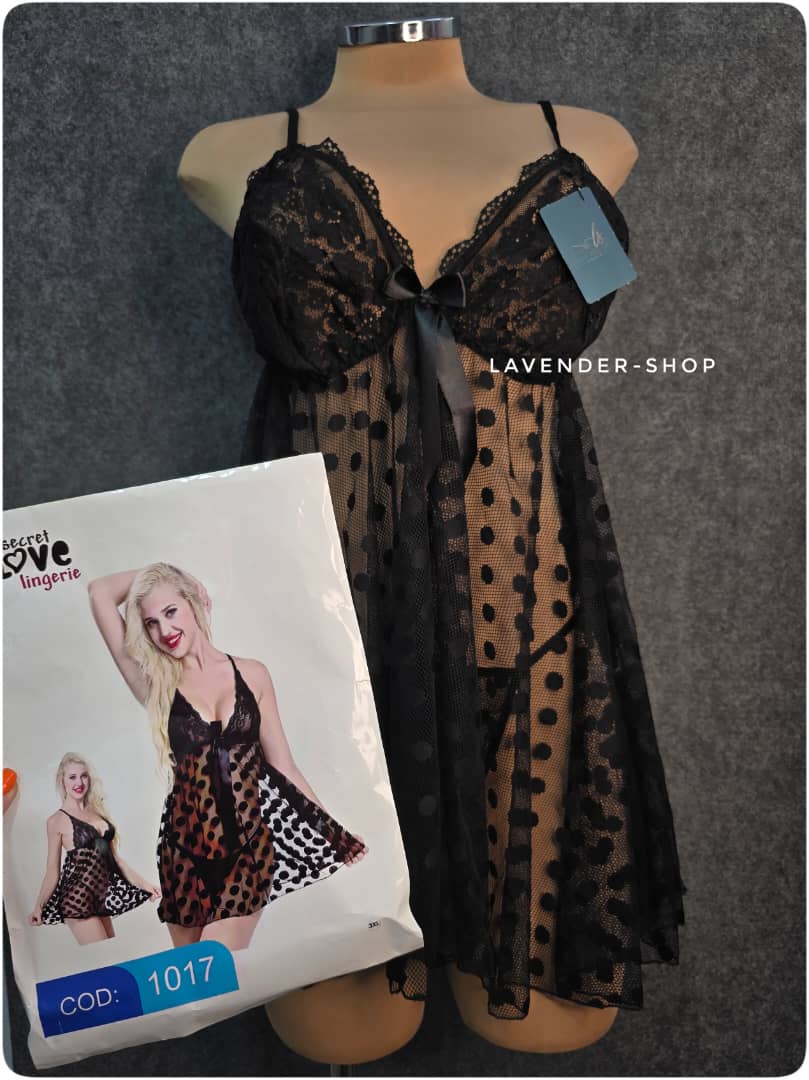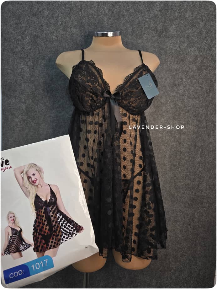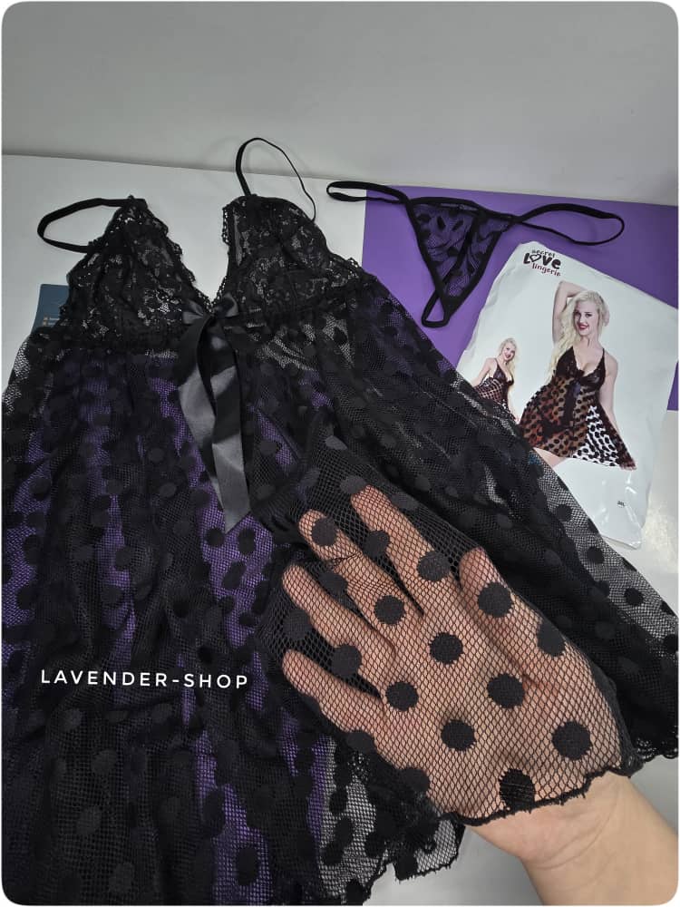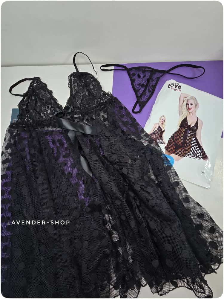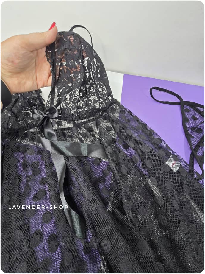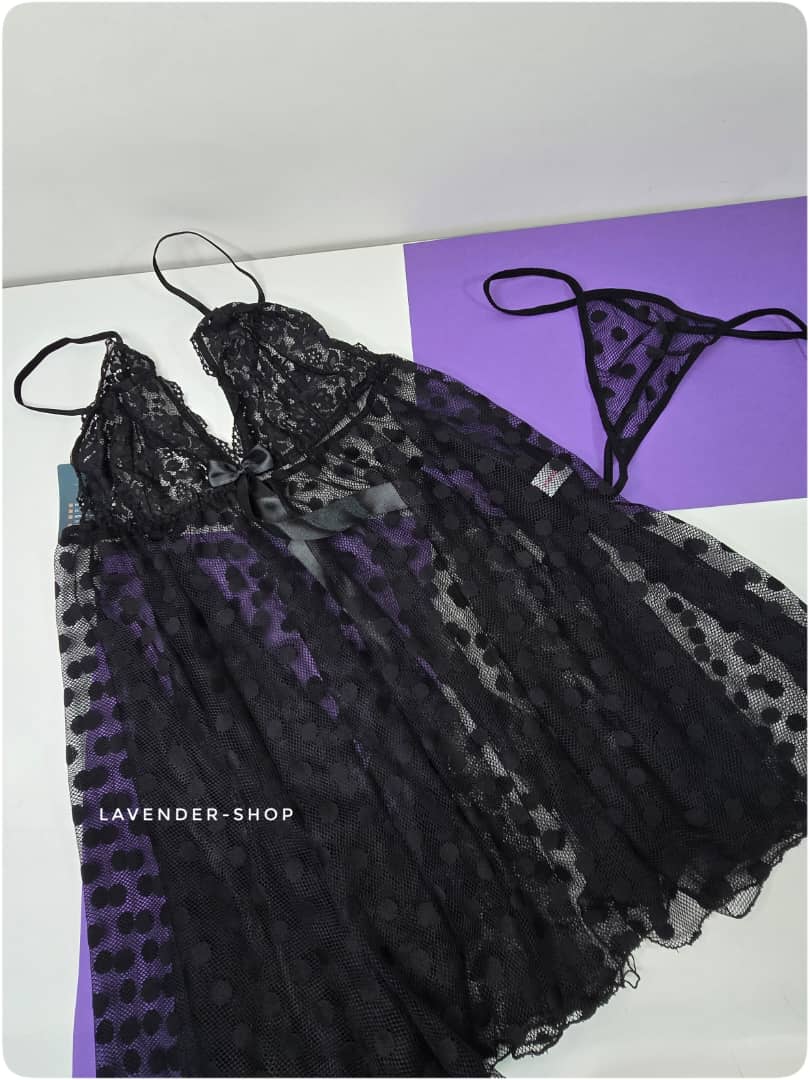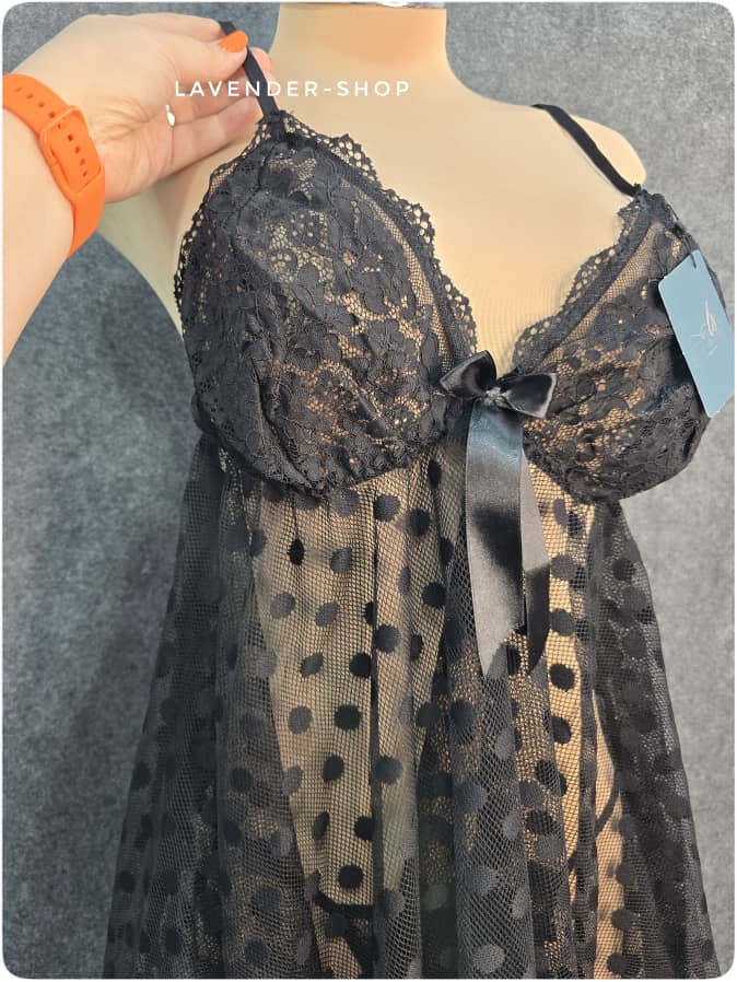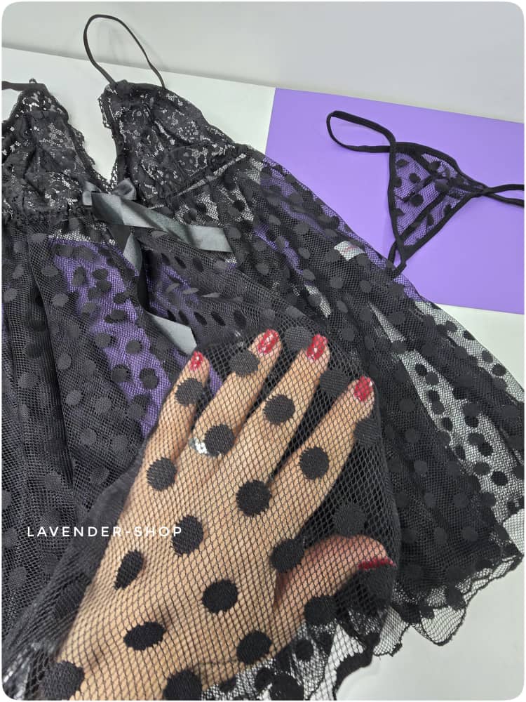 لباس خواب سایز بزرگ (3XL) توری مشکی خالدار | همراه شورت بکلس ست